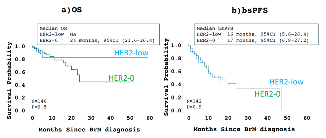 在752例可评估患者中,有340例具有HER2状态信息,其中181例(53.2%)为HER2阳性,65例(19.11%)为HER2低表达,94例(27.6%)为HER2零表达。与TNBC亚组相比,HR+亚组中的HER2低表达更为常见(61.5%vs 33.8%)。HER2低表达和HER2零表达患者之间的总生存(OS)和脑特异性无进展生存(bsPFS)没有显著差异。