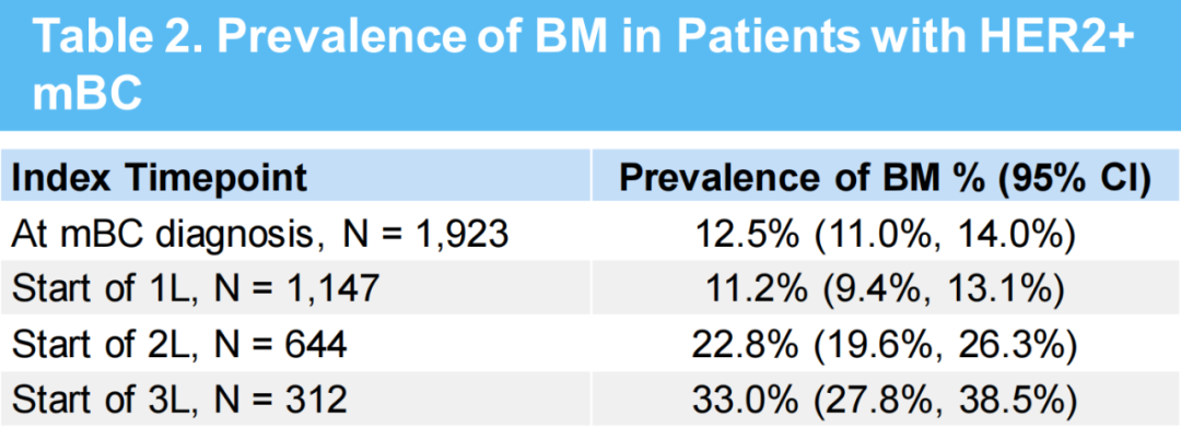 在HER2+mBC诊断时,脑转移的患病率为12.5%(140/1923),其中HR+占55.8%。在一线、二线、三线治疗时,脑转移的患病率分别为11.2%、22.8%和33.0%。