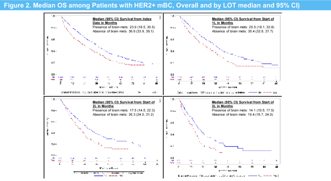从这项真实世界研究可以看出,在HER2+mBC患者中,脑转移的患病率随着治疗线数的增加而增加;而且与没有脑转移患者相比,脑转移患者的生存预后更差。