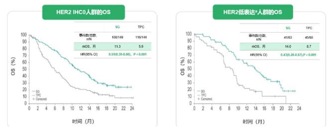 无论 HER2 状态如何,SG在HER2 IHC0和HER2低表达的mTNBC人群的OS均有显著获益