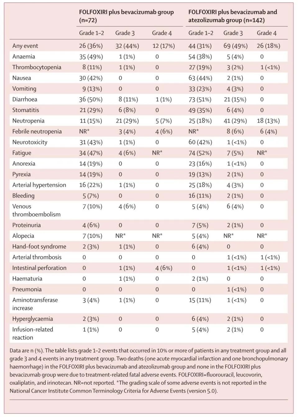 安全性评估方面:最常见的3~4级治疗相关不良事件为中性粒细胞减少(治疗组vs.对照组:42%vs.36%)、腹泻(15%vs.13%)以及粒缺性发热(10%vs.10%)。试验组有39例(27%)患者、对照组有19例(26%)患者报告了严重不良事件。阿替利珠单抗组报告了2例(1%)治疗相关死亡(由于急性心肌梗死和支气管肺出血),对照组未见报告。见表1。