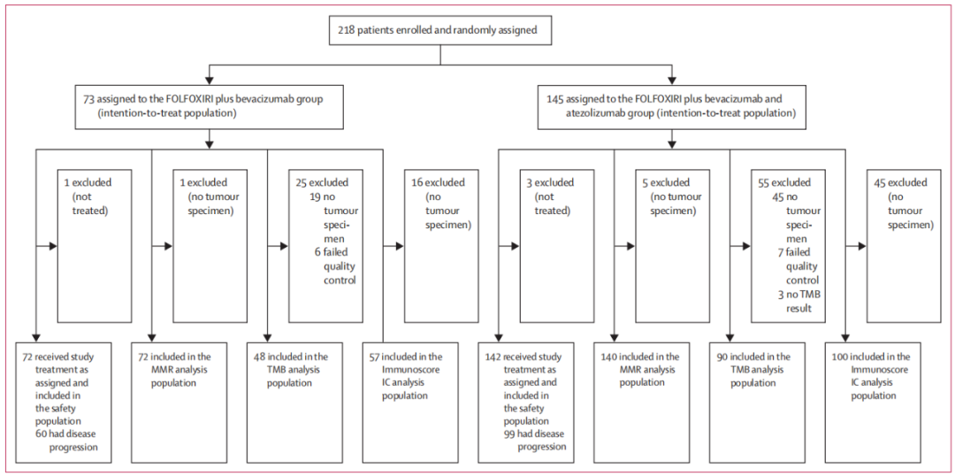 AtezoTRIBE研究是一项多中心、开放标签、随机、对照的Ⅱ期临床研究。研究纳入了来自意大利22家肿瘤研究中心招募的初始不可切除的mCRC患者。入组标准:年龄18~70岁,ECOG评分为0~2;年龄71~75岁,ECOG评分为0;经组织学证实肿瘤不可切除;既往未经治疗且器官功能良好的mCRC患者。根据研究中心、ECOG评分、原发肿瘤部位和既往辅助治疗对患者进行分层。研究共纳入218例患者,按1:2随机分为对照组(n=73)和试验组(n=145)。对照组接受一线FOLFOXIRI化疗+贝伐珠单抗靶向治疗(CPT-11:165 mg/m2 d1,L-OHP:85 mg/m2 d1,CF:200 mg/m2,5-FU:3200 mg/m2 48h civ)+Bev(5mg/kg),每2周为1周期;试验组接受相同方案治疗联合阿替利珠单抗(840mg ivgtt)。根据随机分组,联合治疗最长持续8个周期,随后给予5-FU+CF+Bev±阿替利珠单抗维持治疗,直至疾病进展、出现不可耐受的不良事件或撤回知情同意。主要终点是PFS,安全性评估在至少接受一次研究剂量的受试者中进行。目前这项研究招募已经结束,该研究已经注册在Clinicaltrials.gov,NCT03721653。