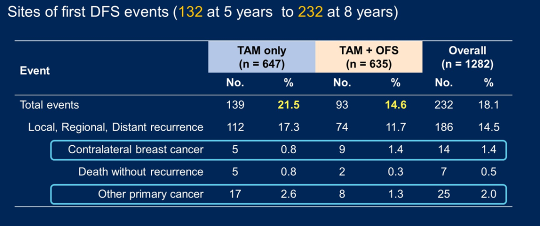 本次大会更新了其8年随访结果。中位随访106.4个月,TAM+OFS组的8年DFS率仍优于TAM组(85.4%vs.80.2%,HR:0.67,95%CI:0.51~0.87)。TAM+OFS组的DFS事件发生率低于TAM组(14.6%vs.25.1%),除局部区域复发及远处转移外,TAM+OFS组的对侧乳腺癌发生率较高(1.4%vs.0.8%),第二原发肿瘤的发生率较低(1.3%vs.2.6%)。
