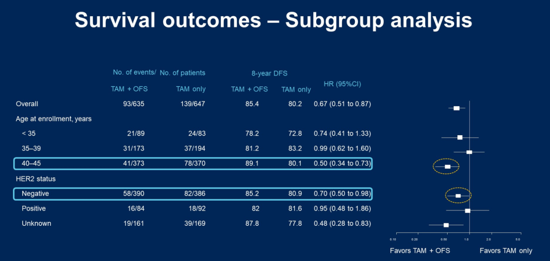 亚组分析显示,化疗后闭经且在6个月内恢复卵巢功能的患者,加用OFS获益明显,可降低其43%的疾病或死亡风险(HR:0.57,95%CI:0.40~0.79);此外,40-45岁亚组和HER2阴性亚组加用OFS获益明显(HR值分别为0.5和0.7)。