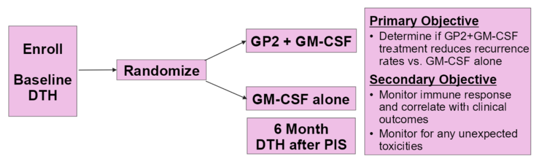 入组该研究的患者被随机分配至①GLSI-100组:术后6个月内的基础免疫(每3-4周注射GP2+GM-CSF,共6次),6个月后接受4剂GLSl-100的加强免疫;②GM-CSF组:初始和加强免疫时期均为GM-CSF。在注射后48-72小时测量注射部位反应(ISR)。在基线检查时和治疗6个月后检测GP2的迟发性超敏反应(DTH)。该研究共纳入了180名HER2阳性(3+)和HER2低表达(1+至2+)的患者。