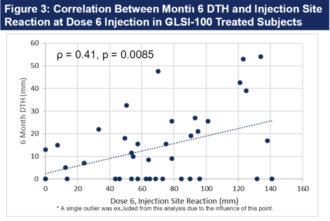 如下图所示,在GLSI-100治疗患者中,发现第6个月的迟发性超敏反应(DTH)与最近一剂(即第6剂)GLSI-100接种的局部注射反应(ISR)相关(ρ=0.41,P=0.0085)。此外,第6个月的DTH反应与大多数ISR相关。