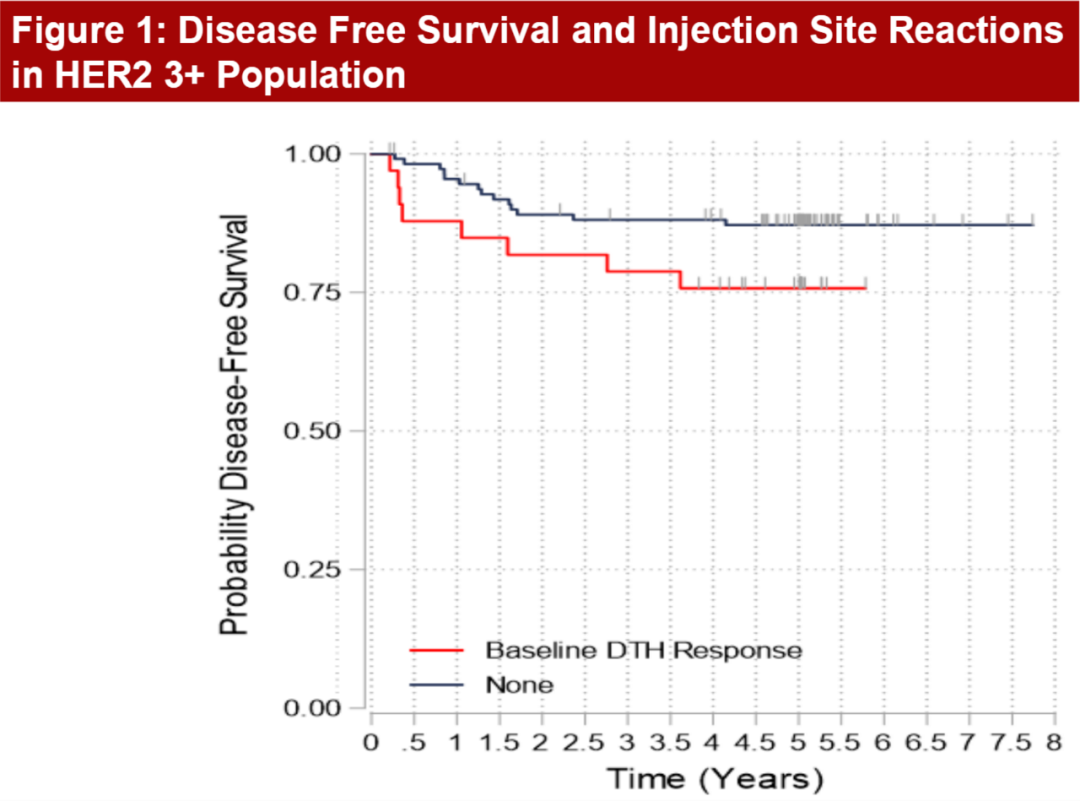 此前曾报道的一项随机对照的IIb期临床试验(NCT00524277)显示,GLSI-100应用于淋巴结阳性、淋巴结阴性但有高危因素的患者(HER2表达为1+至3+),可使5年复发率降至零,即5年DFS率为100%!2022年AACR大会上报告了注射部位反应(ISR)与迟发型超敏反应(DTH)对治疗的影响。