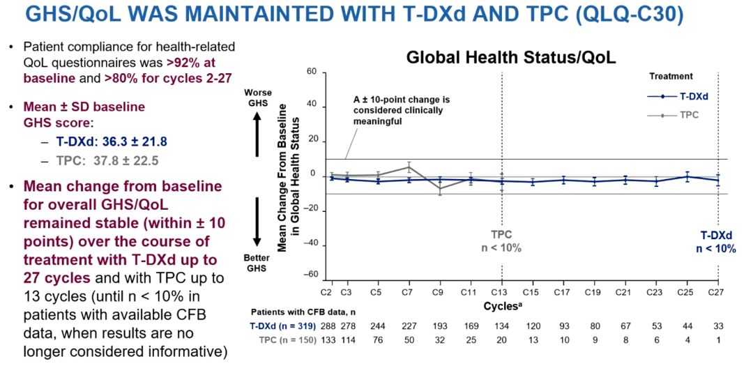 结果显示两组基线时的问卷调查依从性>92%,治疗周期越靠前,患者依从性越好,这一点与临床实际相符合。T-DXd组和TPC组患者的基线GHS评分分别为36.3和37.8。T-DXd疗效好,治疗周期也长,在T-DXd组治疗(27周期)、TPC组(13周期)的过程中,两组患者的QLQ-C30 GHS/QoL自基线变化(CFB)随着时间的推移保持稳定(±10)。但在这些治疗周期之后,接受治疗的患者数量(<10%)则较少,因此无法提供继续分析的信息。