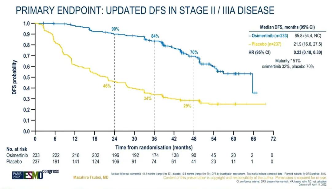 在II/IIIA期患者中,奥希替尼组(n=233)和安慰剂组(n=237)分别经过中位44.2个月和19.6个月的随访,更新的中位DFS数据分别为65.8个月vs 21.9个月(风险比[HR]=0.23;95%CI: 0.18-0.30) 。