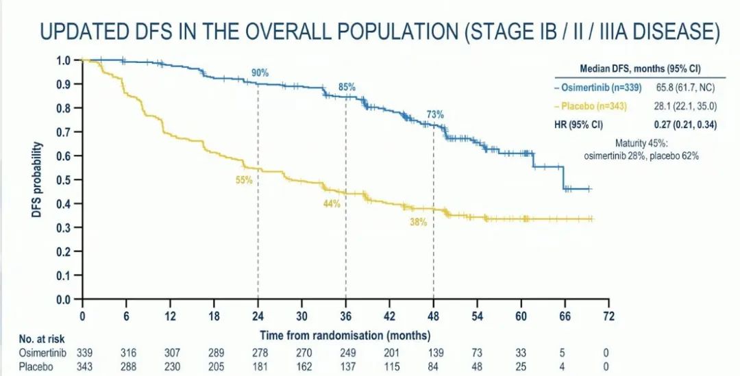 在总体人群中,奥希替尼组(n=339)的中位DFS为65.8个月(95%CI: 61.7-NC),而安慰剂组(n=343)为28.1个月(95%CI: 22.1-35.0),疾病复发或死亡的风险降低了73%(HR=0.27;95%CI: 0.21-0.34)。