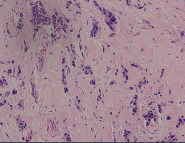 2022-2-22病理:(右乳肿物)乳腺浸润性癌。