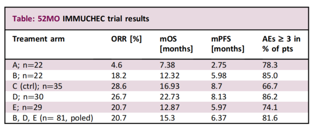 研究方法:IMMUCHEC是一项前瞻性、随机、多中心II期研究(NCT03473574)。ECOG 0-1且组织学证实为转移性BTC/胆囊癌的成年患者符合入组条件。主要终点是未接受过全身姑息性CTx治疗的患者依据RECIST1.1标准评估的客观缓解率(ORR)。次要终点是总生存期(OS)、无进展生存期(PFS)和安全性。探索性分析包括试验治疗组的汇总疗效和安全性分析。试验治疗方案如下:A组D 1.5g Q3W+4xT 75mg Q3W+gem 1000 mg/m2(D+4T+G);B组D 1.5g Q3W+4xT 75mg Q3W+Gem 1000 mg/m2+Cis 25mg/m2(D+4T+GC);C组(对照组)Gem+Cis(GC);D组 D 1.5g Q3W + 1xT 300mg+Gem+Cis(D+1T+GC);E组 D 1.5g Q3W + Gem + Cis(D+GC)。