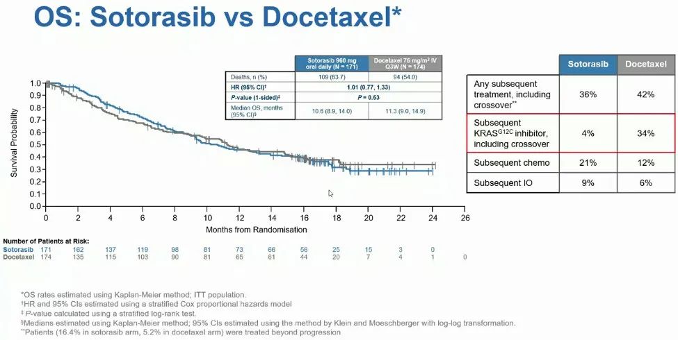 总生存期(OS)在两组之间没有差异,sotorasib和化疗组的中位OS分别为10.6和11.3个月(HR=1.01; p=0.53)。
