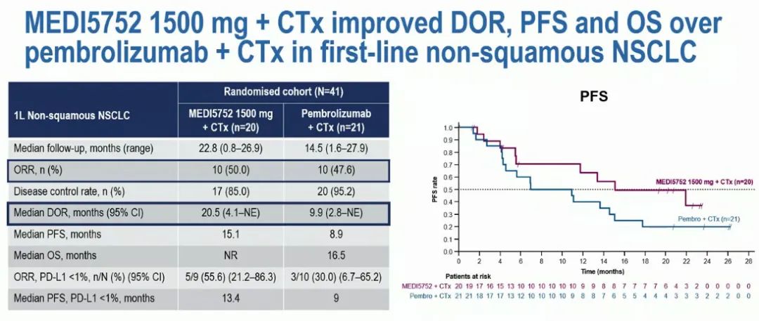 研究结果显示,在1500mg剂量组,MEDI5752+化疗(n=20)和帕博利珠单抗+化疗(n=21)组的客观缓解率(ORR)分别为50.0%和47.6%,中位缓解持续时间(DOR)分别为20.5个月(95% CI: 4.1-不可评估[NE])和9.9个月(95%CI: 2.8-NE),MEDI5752组的中位无进展生存期(PFS; 15.1 vs 8.9个月)和总生存期(OS; 未达到vs 16.5个月)也有显著优势。值得注意的是在PD-L1阴性患者中,ORR再次有利于MEDI5752 1500mg组,分别为55.6%(95%CI: 21.2%-86.3%)和30.0%(95%CI: 6.7%-65.2%),中位PFS分别为13.4个月 vs 9.0个月。与一线帕博利珠单抗联合化疗的标准治疗方案相比,1500mg MEDI5752+化疗延长了初治非鳞NSCLC患者的DOR、PFS及OS, 也提高了PD-L1阴性人群的疗效。