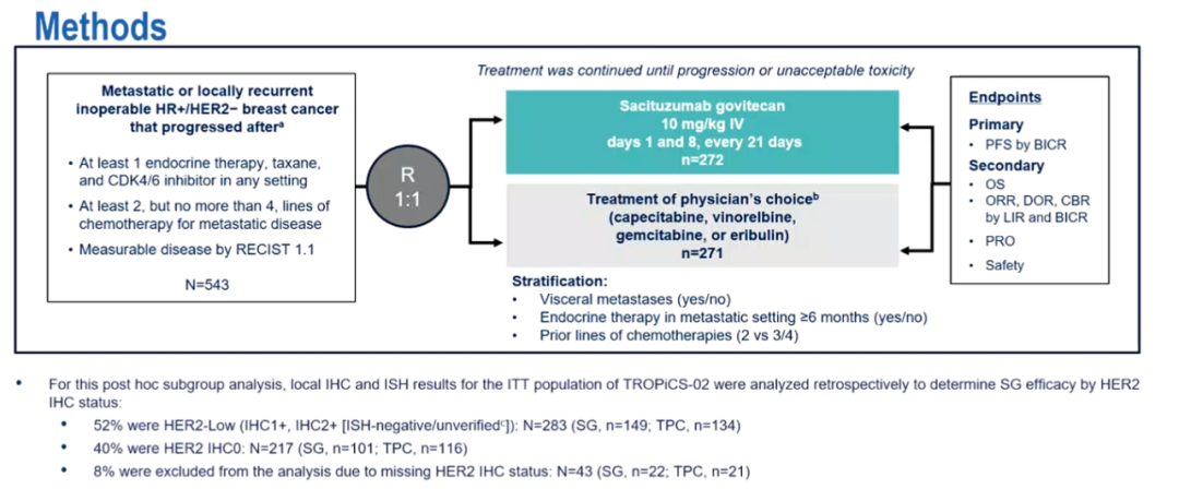 研究背景:免疫组化(IHC)检测HER2 1+或2+且原位杂交(ISH)检测为阴性被定义为HER2-Low。戈沙妥珠单抗(SG)是一种新型Trop-2导向的抗体药物偶联物,已被批准用于治疗二线及以上转移性三阴性乳腺癌。TROPiCS-02研究显示,在经多线治疗且内分泌耐药的HR+/HER2-晚期乳腺癌患者中,与医生选择的治疗(TPC)相比,SG降低了34%的进展或死亡风险(Rugo H,et al.ASCO 2022;LBA1001)。本次TROPiCS-02研究事后分析,比较了SG在HER2 IHC 0和HER2-Low HR+/HER2-晚期乳腺癌患者中的疗效。