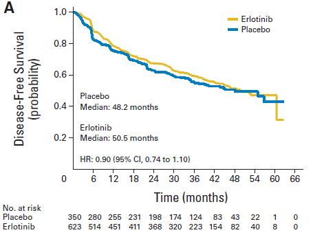 早在2002年,将吉非替尼应用于术后辅助治疗领域的III期临床研究——BR19研究就已经开启。但前503例患者入组后,因无效性分析,研究被提前关闭,因为该研究并不基于突变对患者进行筛选。经过中位4.7年的随访后,并未发现吉非替尼术后辅助治疗可以改善患者的OS(HR=1.24)或DFS(HR=1.22)。4年后,第二个靶向辅助治疗的研究——RADIANT研究开启。虽然该研究已经有意识的筛选患者,但由于当时EGFR突变类型与一代EGFR-TKI疗效的关系尚不明确,因此,研究错误的以EGFR蛋白过表达和基因扩增(FISH方法检测)作为入组标准。最终,以失败告终。不过这个研究中,研究者将EGFR突变患者的DFS和OS设定为关键次要研究终点,共计161例(16.5%)患者,两组中位DFS分别为46.4个月和28.5个月(P=0.039),但未达到统计学显著性。