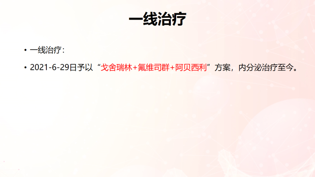 如果从经济学和药物可及性角度考虑,我会继续保留OFS,并且在CDK4/6抑制剂基础上考虑加用mTOR抑制剂,该患者在内分泌治疗之前已经使用过氟维司群并且出现了疾病进展,因此我会换用另外一种内分泌治疗药物,如来曲唑、阿那曲唑等。因为这个患者一线应用内分泌联合CDK4/6抑制剂治疗无进展生存也有十几个月的时间,我认为她还是一个内分泌敏感的患者,所以我优先考虑内分泌治疗的模式,而不推荐化疗。