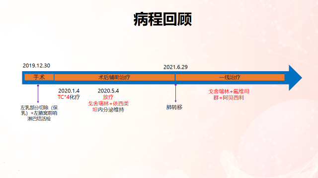 殷咏梅教授:病史中未描述该患者的腋窝淋巴结情况,从术后辅助治疗方案为TC*4周期来判断,患者应该没有出现腋窝淋巴结转移。针对这样一个患者,在接受内分泌辅助治疗仅17个月之后就出现了双肺多发转移,那么该患者极有可能是对内分泌治疗原发性耐药。因此,我们要考虑可能存在内分泌治疗原发耐药的基因突变,也可能存在ER、PR表达水平的下降,甚至ER缺失。在临床实践中也会遇到类似的患者,即在出现复发转移后进行穿刺活检,其ER表达由阳转阴,这也是辅助内分泌治疗后很快出现复发转移的原因之一。由于该患者的转移灶靠近胸壁,可以通过腔镜进行小的肺楔形切除手术来进一步评估患者ER、PR及HER2的状态,从而指导之后的治疗。同时,可以通过二代测序检测来更加客观的反映其一些通路的改变。
