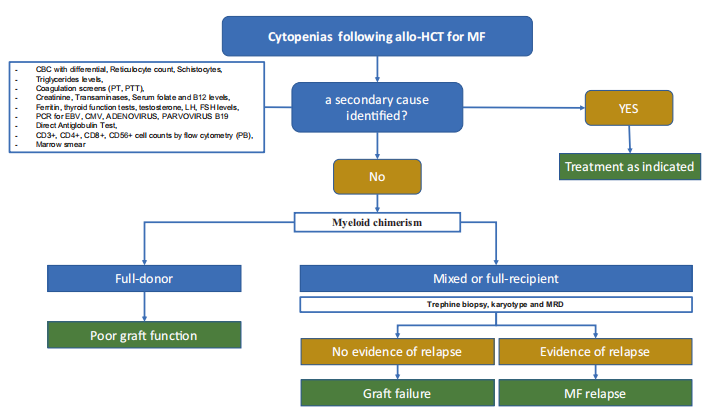 图1:MF患者移植后出现血细胞减少的鉴别诊断流程