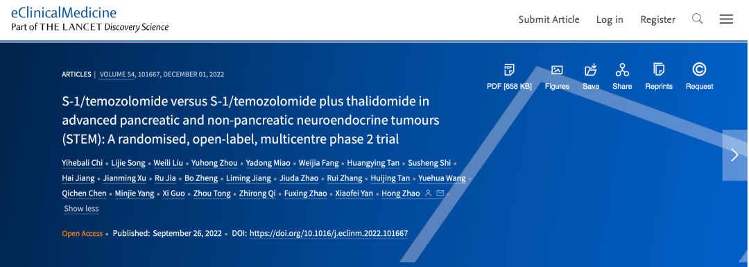 编者按:2022年9月26日,柳叶刀子刊eClinicalMedicine(IF:17.033)发表了中国医学科学院肿瘤医院赵宏教授、依荷芭丽•迟教授领导的多中心、Ⅱ期STEM研究成果论文。此为全球首个在胰腺和非胰腺(包括高分化的NET G3)神经内分泌肿瘤(NETs)患者中,开展前瞻性替莫唑胺联合替吉奥为基础化疗方案的有效性和安全性研究,且首次前瞻性证实MGMT表达可作为替莫唑胺为基础药物治疗的潜在生物标志物。