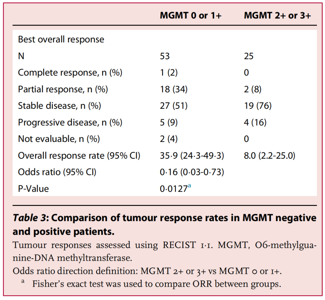 已有回顾性研究的结果表明,MGMT的表达可能与NETs患者对替莫唑胺的治疗反应相关。STEM研究是第一个证实MGMT可作为替莫唑胺疗效预测标志物的前瞻性临床试验。该研究中,MGMT阴性(0/1+)患者的ORR、PFS、OS均显著优于MGMT阳性(2+/3+)患者。