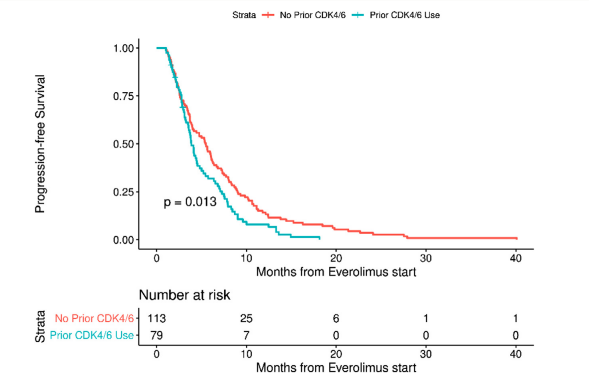 一项纳入了192名受试者的回顾性分析显示,接受过CDK4/6抑制剂的HR+/HER2-晚期乳腺癌患者使用依维莫司联合依西美坦的mPFS为3.8个月,未使用过CDK4/6抑制剂患者的mPFS为5.4个月6。