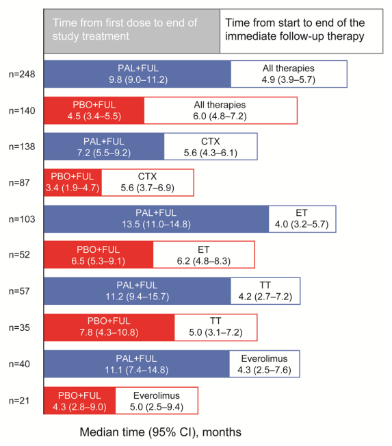PALOMA-3 III期研究的亚组分析结果表明,使用CDK4/6抑制剂治疗进展后,应用标准治疗的mTTF仅为4.9个月,且使用化疗、内分泌治疗、靶向治疗、依维莫司的结局均类似,疗效不尽人意7。