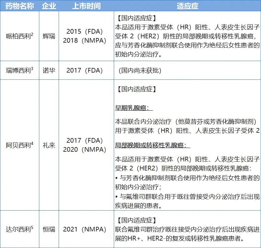 目前全球已获批乳腺癌适应症的CDK4/6抑制剂共有4款,分别是辉瑞的哌柏西利、诺华的瑞博西利、礼来的阿贝西利和恒瑞的达尔西利。获批情况见下: