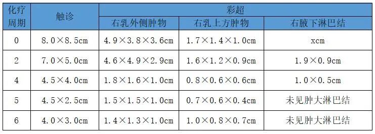 查体:ECOG 1分,双乳对称,右乳中央偏外可触及8.0×8.5cm肿物,质硬,边界不清,活动差。右乳头可见破溃。双侧颈部、双锁骨上、双腋下未及明显肿大淋巴结。