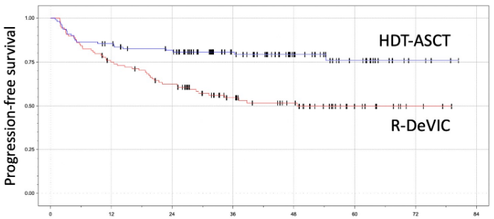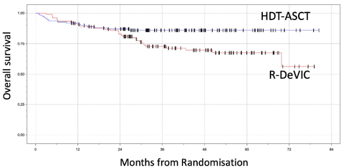 研究概要:该研究中共有229例患者完成诱导治疗,然后1:1随机接受R-DeVIC方案(A组,利妥昔单抗/地塞米松/依托泊苷/异环磷酰胺/卡铂,n=115)或大剂量化疗+自体干细胞移植(B组,卡氮芥/噻替派+ASCT,n=114)进行巩固治疗。旨在探讨两种方案对PCNSL患者的疗效及生存优劣,主要终点指标为无进展生存期(PFS)。结果显示,在生存方面,大剂量化疗+自体干细胞移植组(HDC-ASCT)要明显优于R-DeVIC方案组,3年PFS分别为79%vs 53%(HR=0.42;P=0.0003),3年OS则分别为86%vs 71%(HR=0.47;P=0.01)。
