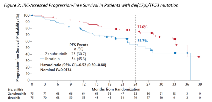 研究概要:研究入组652例复发/难治性慢淋和小淋巴细胞白血病(R/R CLL/SLL)患者,1:1随机接受泽布替尼(Zanubrutinib,n=327)或伊布替尼(Ibrutinib,n=325)治疗,旨在比较两种BTK抑制剂对于R/R CLL/SLL患者的疗效差异,主要的研究终点为客观化解率(ORR),关键的次要终点为PFS。中位随访29.6个月,结果显示:①在ORR方面,泽布替尼组具有一定优势,分别为86.2 vs 75.7%(P=.0007)。②在中位PFS方面,泽布替尼组亦具有明显的优势,伊布替尼组的中位PFS为35个月,而泽布替尼组尚未达到(NR),经过亚组分析发现,对于存在del(17p)/TP53突变的R/R CLL/SLL患者,泽布替尼较之于伊布替尼的PFS优势依然存在。