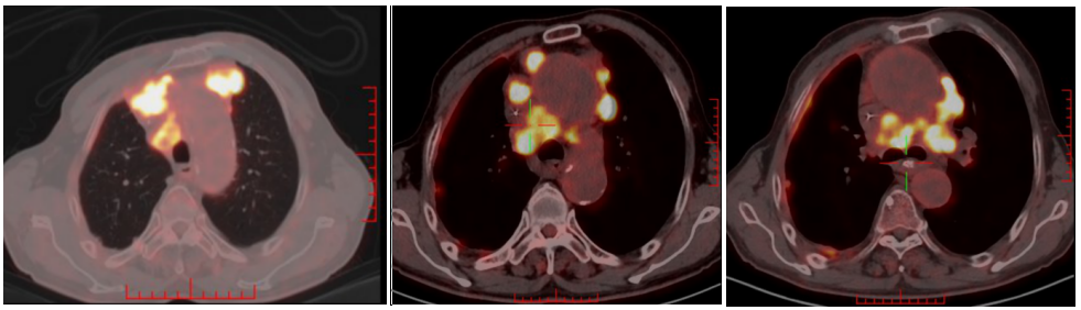 2022-06-28日复查PET-CT:1、双侧头臂血管周围、右侧气管食管沟、纵隔(2R、2L、3a、4R、4L、5、6、7区)右侧肋膈角见多发FDG代谢增高淋巴结,部分淋巴结坏死,结合病史,考虑多发淋巴结转移,病变数目较前增多、体积增大。L3椎体右侧、左侧肩胛冈FDG代谢增高,考虑骨转移。2、右肺上叶前段胸膜下环形FDG代谢增高病变中心伴有坏死,病变较前稍增大;左肺上叶舌段及下叶内前基底段、右上叶及下叶多发结节,部分伴FDG代谢增高,较前未见明显变化;右侧胸膜增厚伴右侧胸膜增厚伴FDG代谢增高,较前增厚,右侧胸腔积液较前减少。余未见转移征象。综上:多发淋巴结转移,新发骨转移,考虑PD。