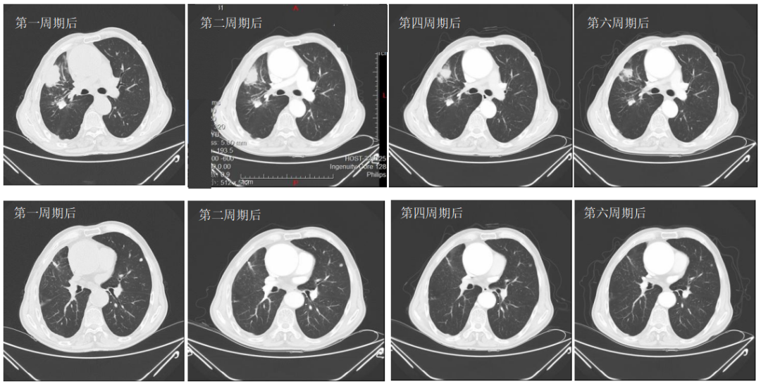 摘要:肺癌是肿瘤相关死亡率最高的疾病[1]。小细胞肺癌是肺癌之中侵袭性最强的一种亚型,此类肿瘤恶性程度高、倍增时间短、易发生远处转移,初次就诊时即有约2/3患者确诊为广泛期,小细胞肺癌约占所有肺癌患者的15-20%,与吸烟关系密切。NCCN小细胞肺癌临床实践指南2023.v1和2022 CSCO小细胞肺癌诊疗指南推荐免疫治疗联合化疗一线治疗广泛期小细胞肺癌,患者的中位PFS为5个月左右,中位OS超过12个月[2,3]。在既往的临床实践中,尽管SCLC对于一线化疗(依托泊苷/伊立替康联合铂类)非常敏感,但大多数的SCLC患者在初始治疗后很快出现复发及耐药。一线治疗进展后,患者的治疗手段非常局限[4]。相关文献报道,NSCLC患者使用PD-1药物治疗进展后,换用PD-L1抑制剂仍能发挥抗肿瘤效应[5,6]。PD-1抑制剂与PD-L1抑制剂抗肿瘤机制略有不同,斯鲁利单抗作为上海复宏汉霖首款自主研发的创新生物药PD-1抑制剂,其疗效已在多个瘤种中得到验证。本文分享一例经阿替利珠单抗(PD-L1抑制剂)联合化疗一线治疗进展后,二线治疗换用斯鲁利单抗(PD-1抑制剂)联合化疗治疗ES-SCLC患者的病例,探索免疫治疗在ES-SCLC患者中的应用。