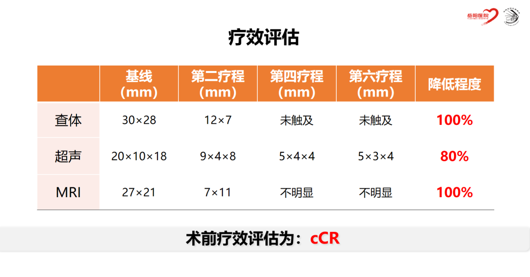 NAC期间每间隔2个化疗周期进行疗效评估,2周期后乳房肿块和腋窝淋巴结明显退缩,4周期后临床触诊阴性,6周期后影像学评估cCR,具体如下: