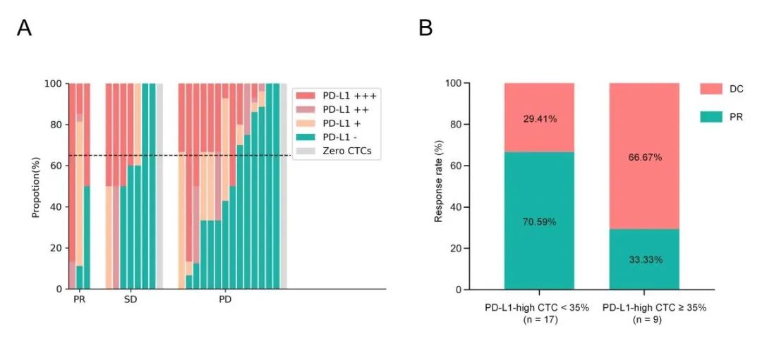 在26例患者中,15例(57.7%)病情进展(PD),8例(30.8%)病情稳定(SD),另外3例(11.5%)获得部分缓解(PR)。为了确定CTCs上PD-L1的表达是否与患者PD-1免疫治疗的疗效相关,我们对CTCPD-L1+++的个数在总CTCs中的比例分布进行了全面的评估。当临界值为35%时,低于和高于临界值的临床获益率(CBR)分别为29.4%(5/17)和66.6%(6/9)。