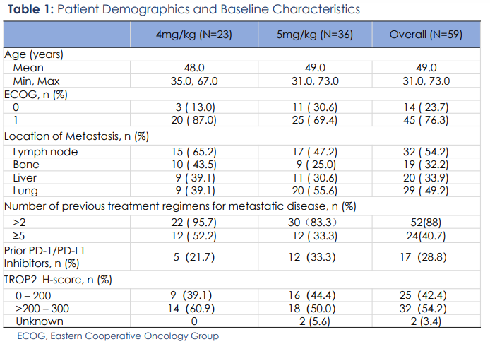 基线特征:研究入组了59例患者(4mg/kg组23例,5mg/kg组36例),88%的患者接受过针对转移性疾病的3种及以上方案治疗,40.7%的患者接受过针对转移性疾病的5种及以上方案治疗,28.8%的患者接受过抗PD-1/L1治疗。57例患者可进行TROP2检测,其中54.2%为TROP2高表达(定义为H评分>200~300)。
