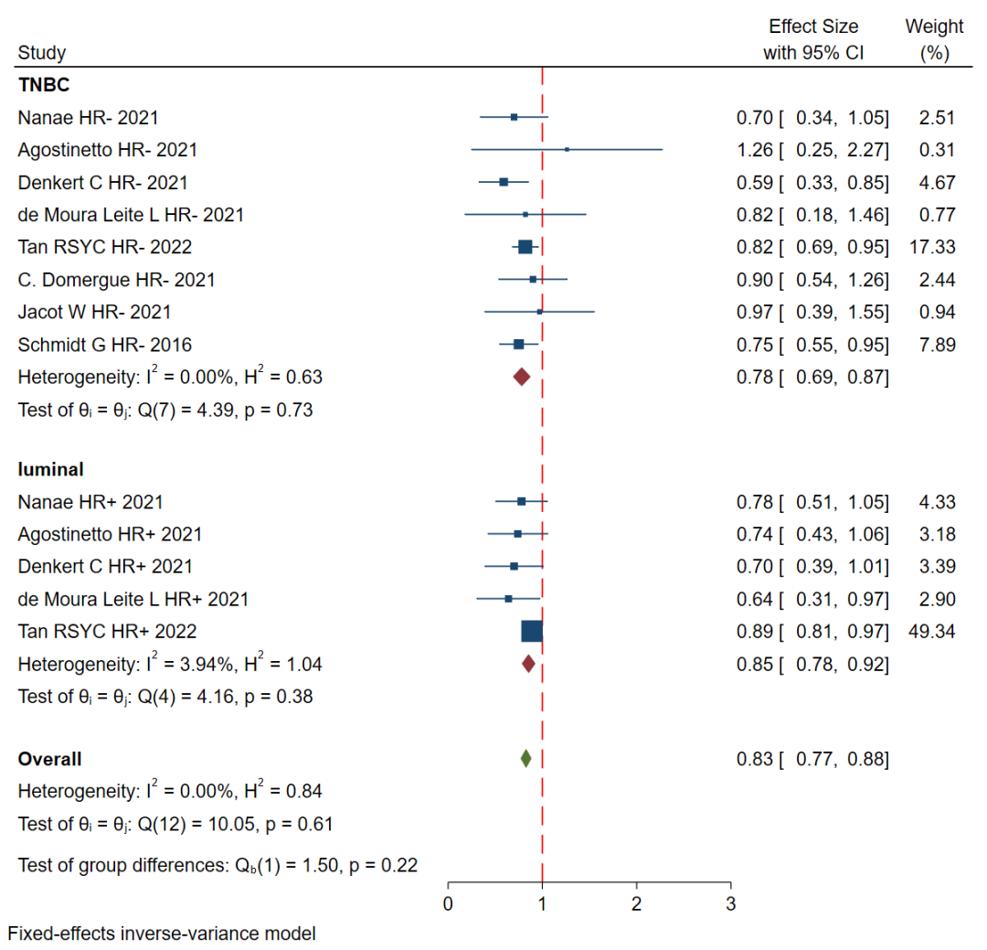 在亚组分析中,我们发现在激素受体阳性的乳腺癌患者中,HER2低表达的患者有更好的生存结果(OS:HR 0.85;95%CI:0.78~0.92;DFS/RFS:HR 0.90;95%CI:0.84~0.96)。同样,在三阴性乳腺癌患者中,我们也观察到了HER2低表达与更好的生存之间的正相关关系。(OS:HR 0.78;95%CI:0.69~0.87。0.69~0.87;DFS/RFS:HR 0.86;95%CI:0.77~0.94).(图3a和3b)