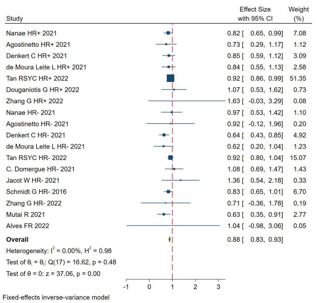 研究方法:我们通过PubMed、EMBASE和Cochrane图书馆进行了全面的医学文献检索,截止时间直至2022年6月。12篇报告了危险比(HRs)和相应的95%置信区间(CIs)的观察性研究被纳入,总共涉及39831名乳腺癌患者。各项研究的结果通过固定效应模型进行合并。