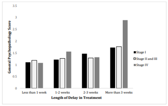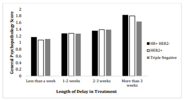 研究发现无论治疗类型如何,处于晚期的乳腺癌患者在治疗时间延迟较长的情况下更容易出现心理症状,并且治疗时间持续延迟患者比恢复治疗患者的心理症状更严重。此外,治疗延迟超过三周可能会加重乳腺癌患者的心理症状,而短期延迟(少于三周)则不太可能对患者的心理健康产生显著影响。