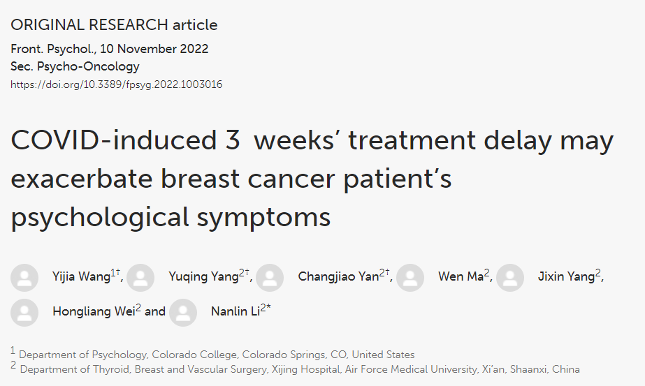 编者按:2022年美国圣安东尼奥研讨会(SABCS)已于当地时间12月10日圆满落幕。我国李南林教授团队的一项研究入选壁报展示,该研究利用症状自评量表SCL-90-R分析了新冠疫情对我国乳腺癌患者的心理影响,研究结果同步发表于《心理学前沿》(Frontiers in Psychology)杂志(IF=4.232)。《肿瘤瞭望》特邀空军军医大学李南林教授对该项研究进行介绍。
