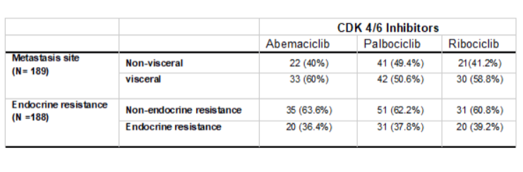 入组人群:研究共纳入189例患者,分别55例(29.1%),83例(44%),51例(27%)接受阿贝西利、哌柏西利、瑞博西利联合内分泌治疗。104例(55%)患者联用AI,85例(45%)患者联用氟维司群。50例(27%)为初治IV期患者,139例(73%)为既往疾病复发。表1显示了每组内脏受累和内分泌抵抗的患者比例。