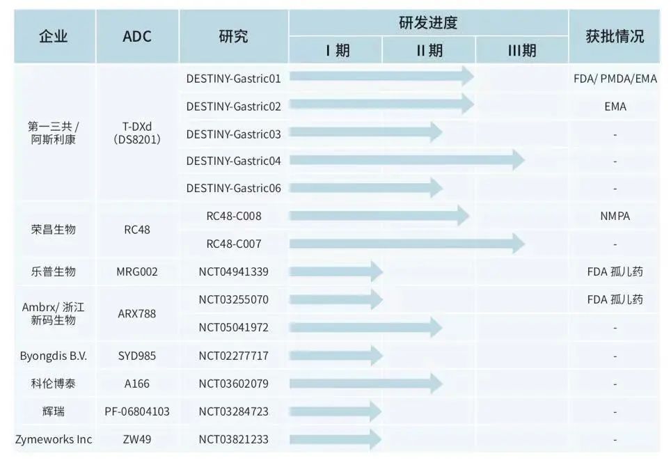 目前获批应用于胃癌领域的ADC主要有T-DXd和RC48,其他ADC如ARX788、MRG002、SYD985等的临床研究也在如火如荼的开展。
