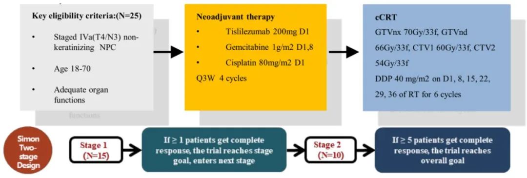 主要研究终点为新辅助治疗后的完全缓解(CR)率(根据RECIST v1.1),次要终点包括:新辅助治疗后的客观缓解率(ORR)、cCRT后的ORR、1年DFS、2年DFS、1年OS、2年OS以及耐受性。