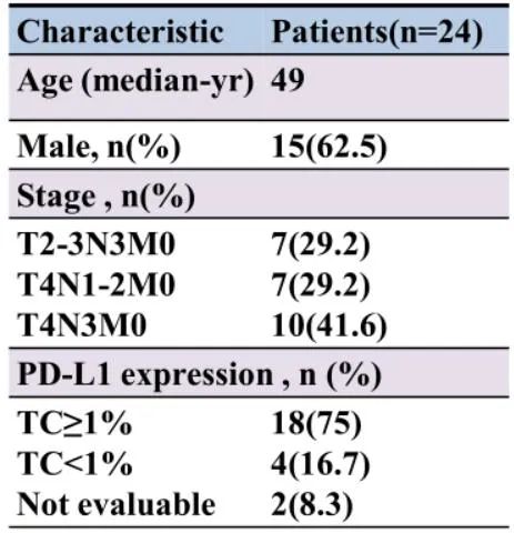 2022年2月至6月,在江门市中心医院共入组25例患者。24例患者根据RECIST v1.1由研究者进行评估。1例患者因急性腮腺癌的治疗而退出了试验。患者的基线特征见表1。