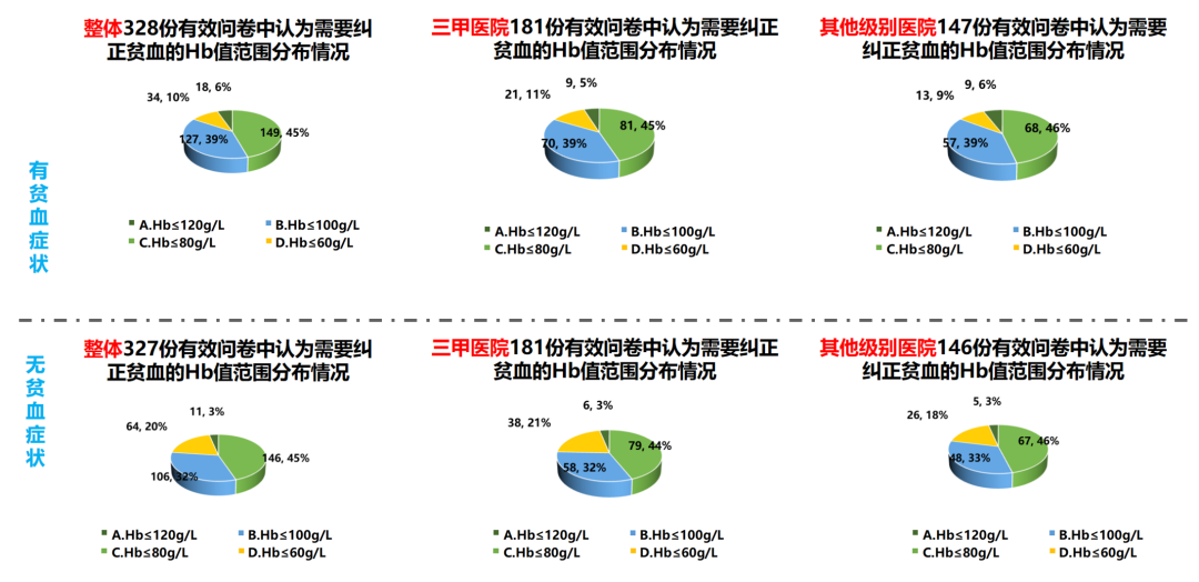 对于有贫血症状的化疗患者,在受访者认为需要进行贫血纠正治疗的Hb范围(≤60 g/L、≤80 g/L、≤100 g/L、≤120 g/L)中,最常选择的是≤80 g/L(n=149,45%)、≤100 g/L(n=127,39%);对于无贫血症状的化疗患者,启动贫血治疗的最常见Hb范围也同样是≤80 g/L(n=146,45%)、≤100 g/L(n=106,32%)。然而,当Hb≤60g/L时,相较于无症状患者,更多的受访者认为有症状患者需要进行贫血治疗(20%vs 10%)。三甲医院和其他级别医院受访者的观点分布与整体人群相似(图4)。