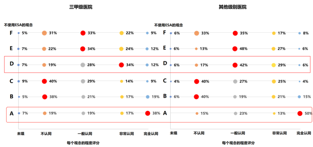 需要注意的是,尽管三甲医院和基层医院的ESA用药观点总体一致,基层医院的可及性较差可能导致其对ESA用药观点的认同度与三级医院存在差异,例如三甲医院完全认同“ESA不可及”的比例低于其他级别医院(38%vs 50%);而非常认同“ESA起效慢”的比例高于其他级别医院(34%vs 29%);可能由于三甲医院的ESA可及性更好,临床医生则有更多关于ESA疗效和安全性的经验和思考。
