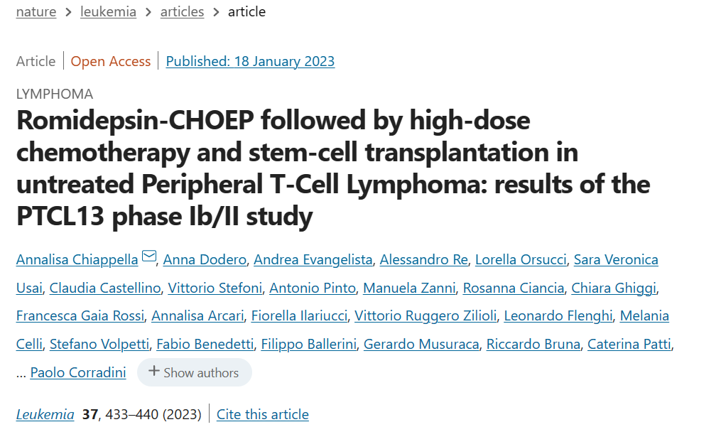 编者按:外周T细胞淋巴瘤(PTCL)约占所有非霍奇金淋巴瘤的10%~15%,除外ALK阳性间变大细胞淋巴瘤(ALCL)患者,大多PTCL患者预后较差[1]。晚期PTCL患者的常见一线治疗为CHOP方案(环磷酰胺、多柔比星、长春新碱、强的松)联合或不联合依托泊苷(CHOEP),然后进行大剂量化疗和自体干细胞移植(HDT+auto-SCT)作为巩固治疗(对于65岁以下患者)[2-4]。几项Ⅱ期试验的结果表明,在诱导治疗后达到首次缓解的患者中,有30%因出现难治性疾病而最终未能接受移植[5,6]。即使成功移植,也仅有40%患者达到治愈。