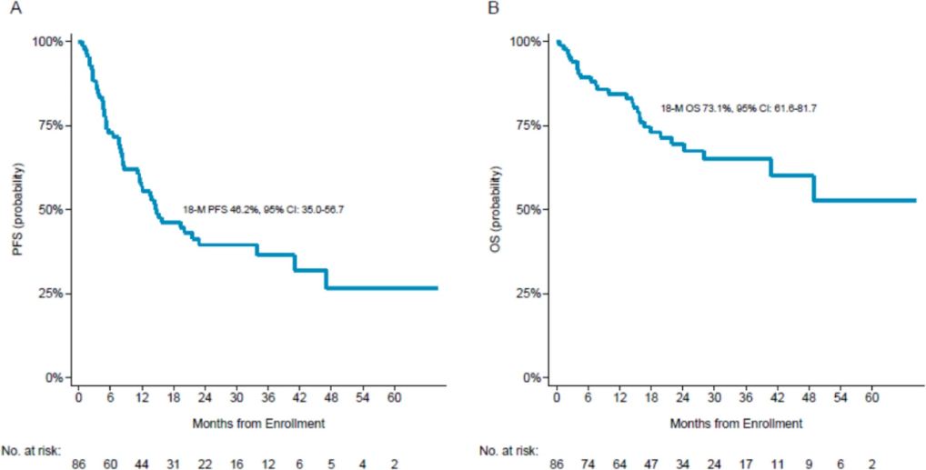 △18个月时的无进展生存期和总生存期(A:PFS;B:OS)