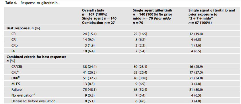 纳入2019年3月1日~2021年3月1日期间37个法国医疗中心接受gilteritinib治疗的167例(队列A)FLT3-ITD和/或TKD突变的AML患者,其中140例(队列B)接受gilteritinib单药治疗,67例(队列C)接受过强化疗+米哚妥林治疗,另外27例接受含gilteritinib在内的联合治疗。