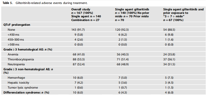 有89例(66.9%)患者因疗效不佳或死亡而停止gilteritinib治疗,而18例(13.5%)患者因Allo-HSCT而停止gilteritinib治疗,14例(10.6%)患者因其他原因停止治疗。下表中描述了≥3级血液学和非血液学不良事件。共有6例(4.3%)患者发生了分化综合征,1例(0.7%)患者发生了肿瘤溶解综合征。